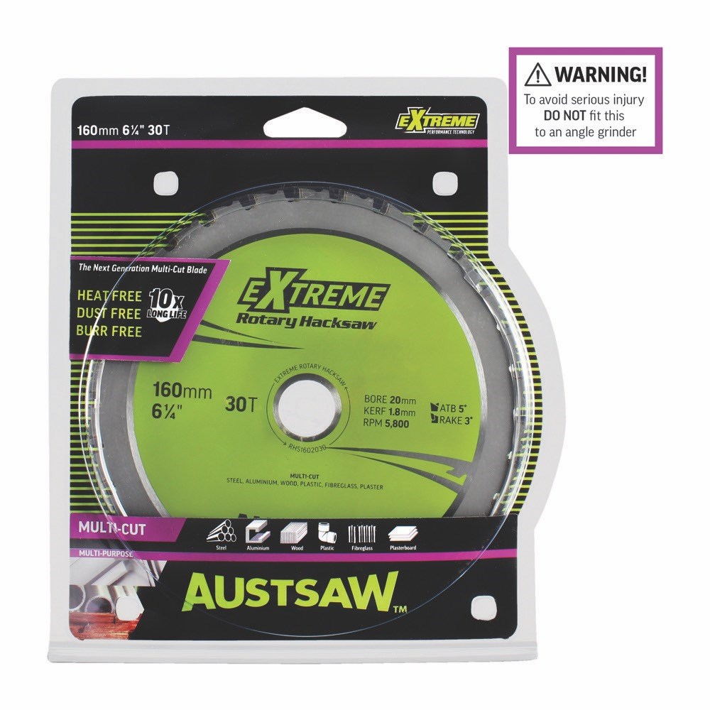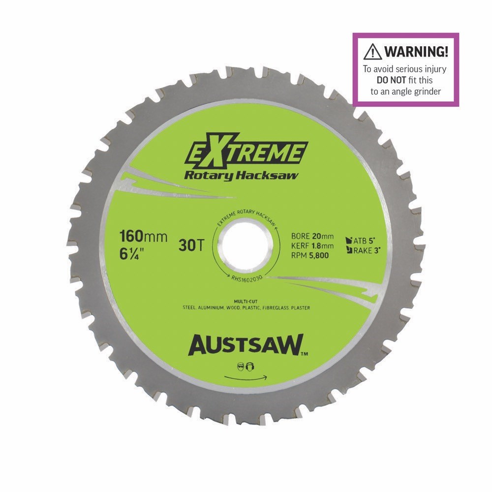 The Austsaw Rotary Hacksaw cutting blade is made with a hardened tempered body for clean, smooth cuts (fast and smooth cutting action). Titanium carbide teeth provide longer life when metal cutting, and a high-raised shoulder provides maximum strength behind each tip. Purchase the Austsaw Rotary Hacksaw circular saw blade and you will experience extreme cutting performance!