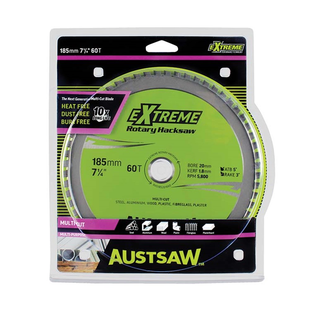 The Austsaw Rotary Hacksaw cutting blade is made with a hardened tempered body for clean, smooth cuts (fast and smooth cutting action). Titanium carbide teeth provide longer life when metal cutting, and a high-raised shoulder provides maximum strength behind each tip. Purchase the Austsaw Rotary Hacksaw circular saw blade and you will experience extreme cutting performance!