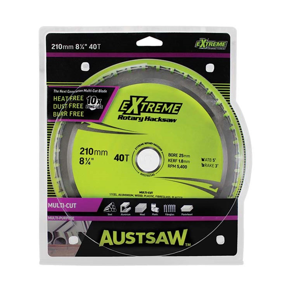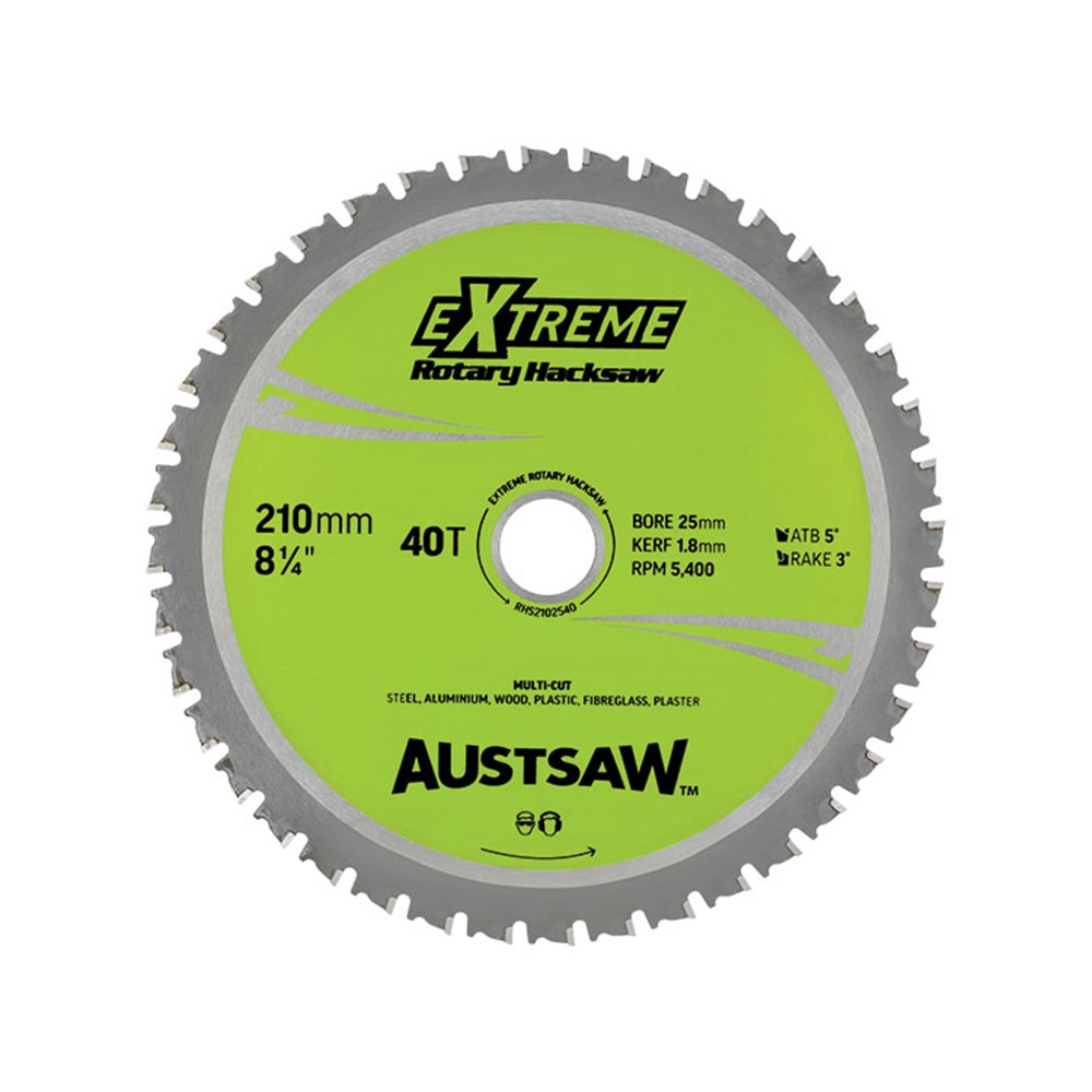 The Austsaw Rotary Hacksaw cutting blade is made with a hardened tempered body for clean, smooth cuts (fast and smooth cutting action). Titanium carbide teeth provide longer life when metal cutting, and a high-raised shoulder provides maximum strength behind each tip. Purchase the Austsaw Rotary Hacksaw circular saw blade and you will experience extreme cutting performance!