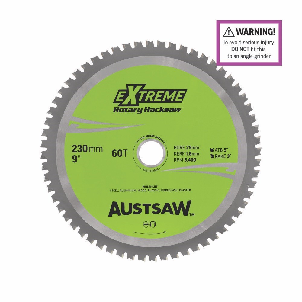 The Austsaw Rotary Hacksaw cutting blade is made with a hardened tempered body for clean, smooth cuts (fast and smooth cutting action). Titanium carbide teeth provide longer life when metal cutting, and a high-raised shoulder provides maximum strength behind each tip. Purchase the Austsaw Rotary Hacksaw circular saw blade and you will experience extreme cutting performance!